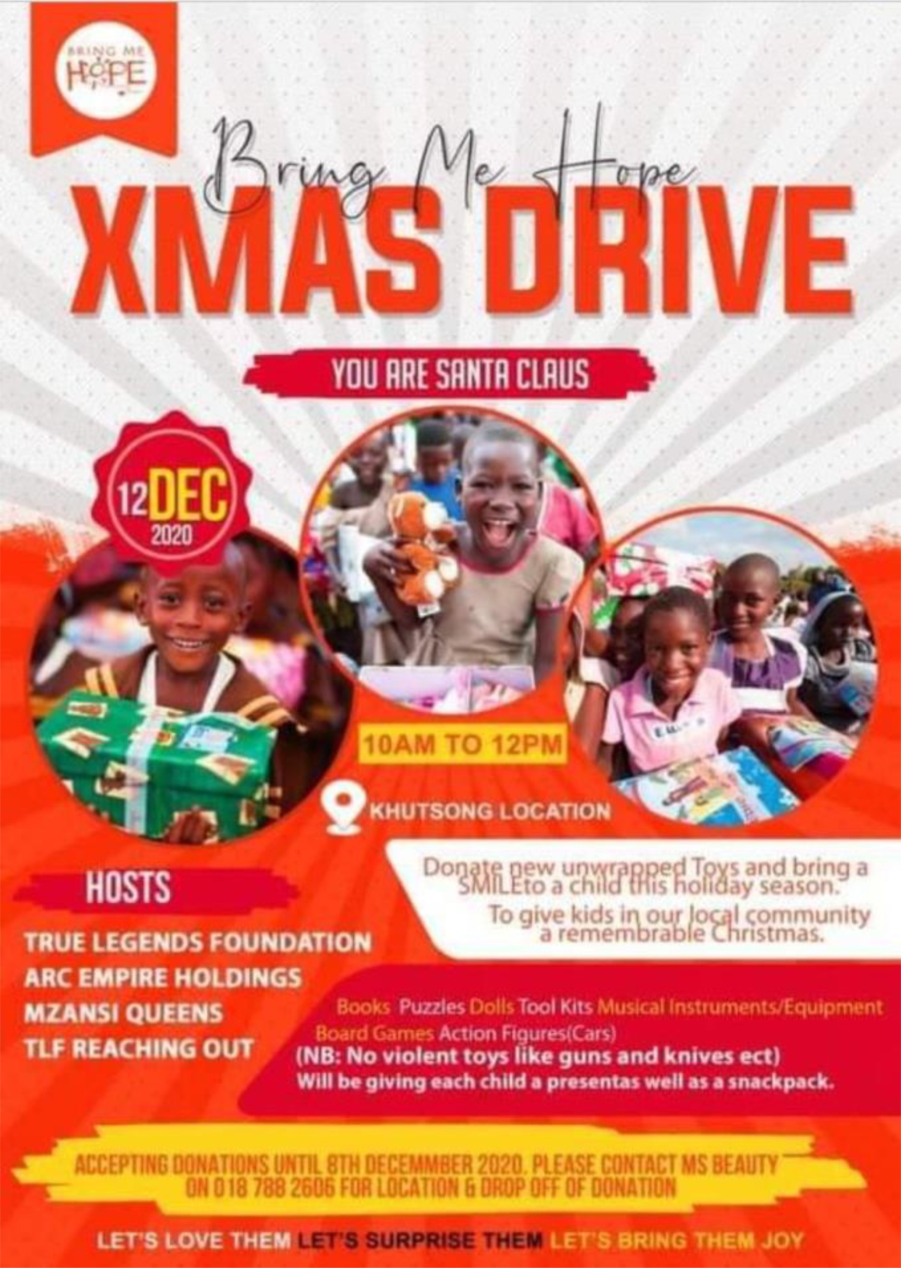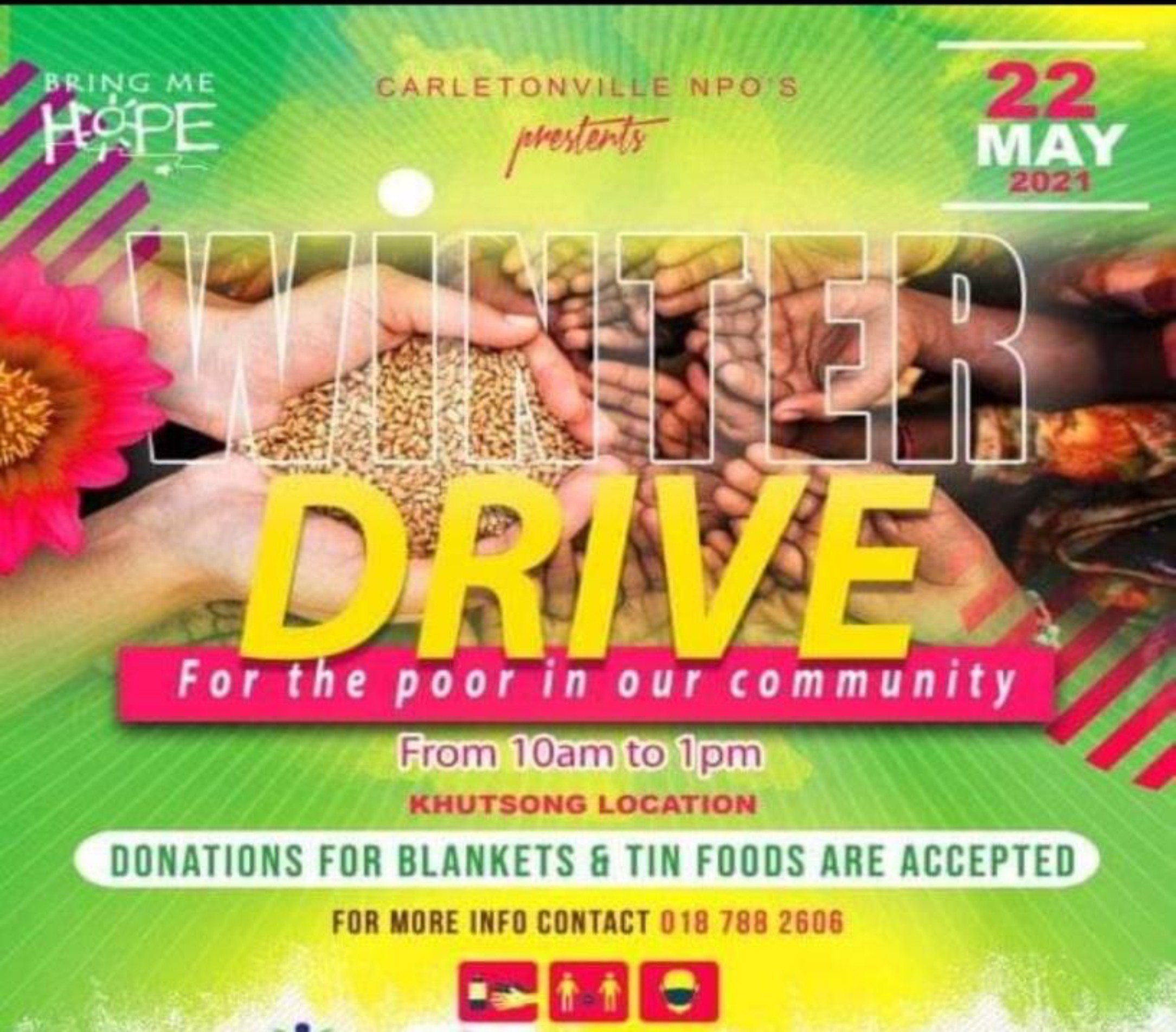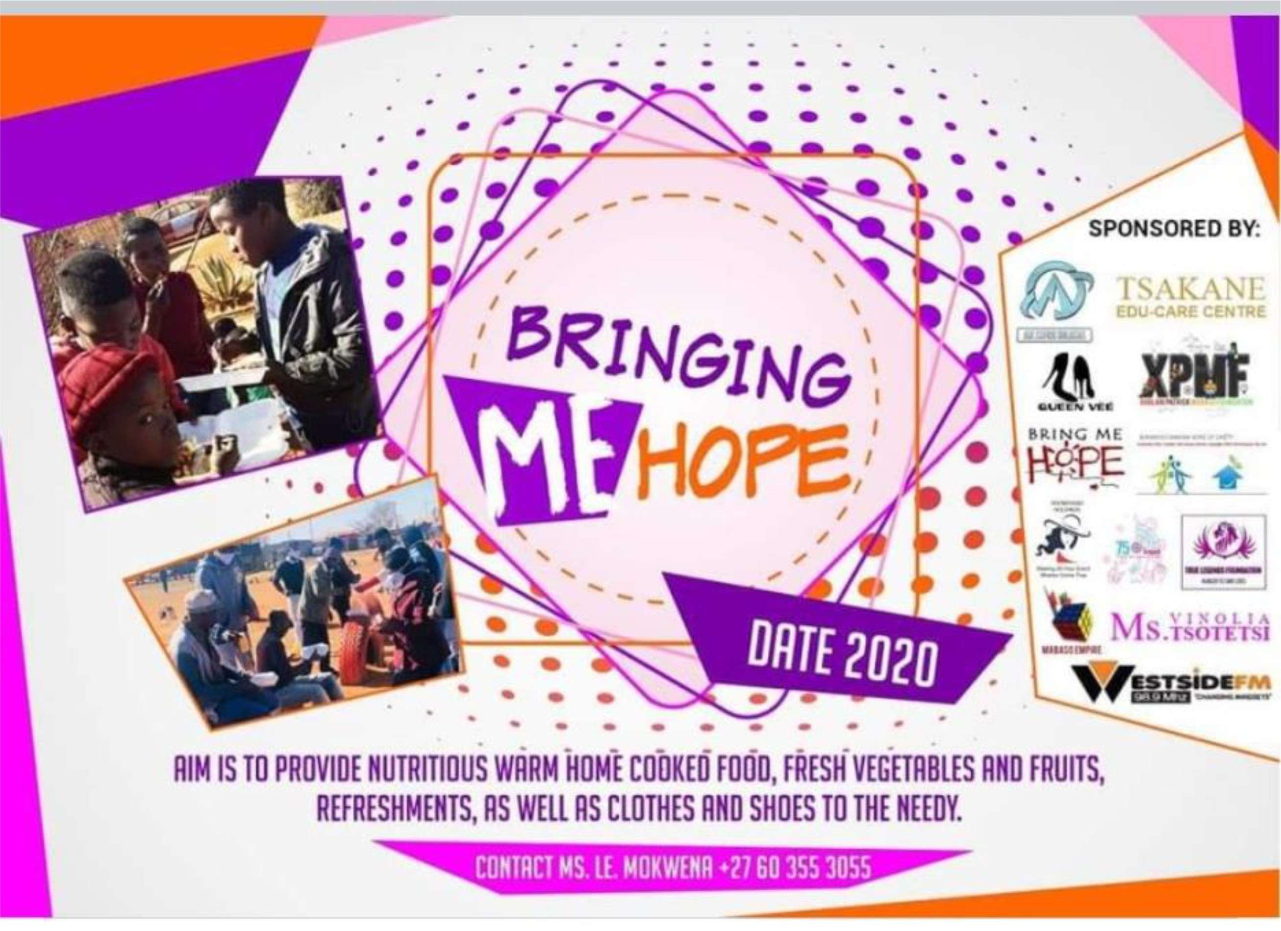 “BRINGING ME HOPE” 2020 WE RAISED AWARENESS OF COVID AS WELL AS COOKED NUTRITIONAL FOOD AND JUICE TO FEED THE SUFFERING INDIVIDUALS IN OUR COMMUNITY;CAR GUARDS;STREET KIDS;HOMELESS INDIVIDUALS AND THE NEEDY.ALL FUNDED BY US CONTRIBUTING OUR OWN MONEY WITH A GROUP OF ALMOST 20 INDIVIDUALS MONTHLY.